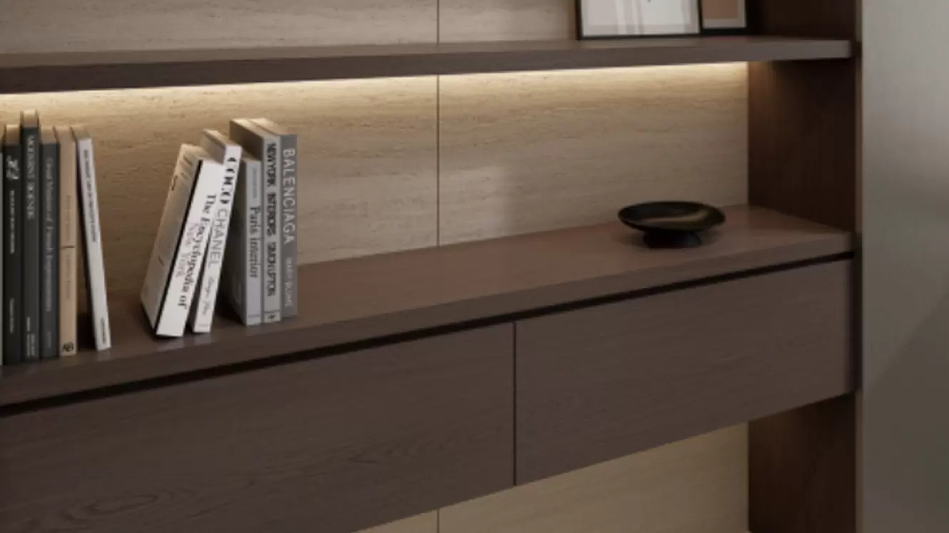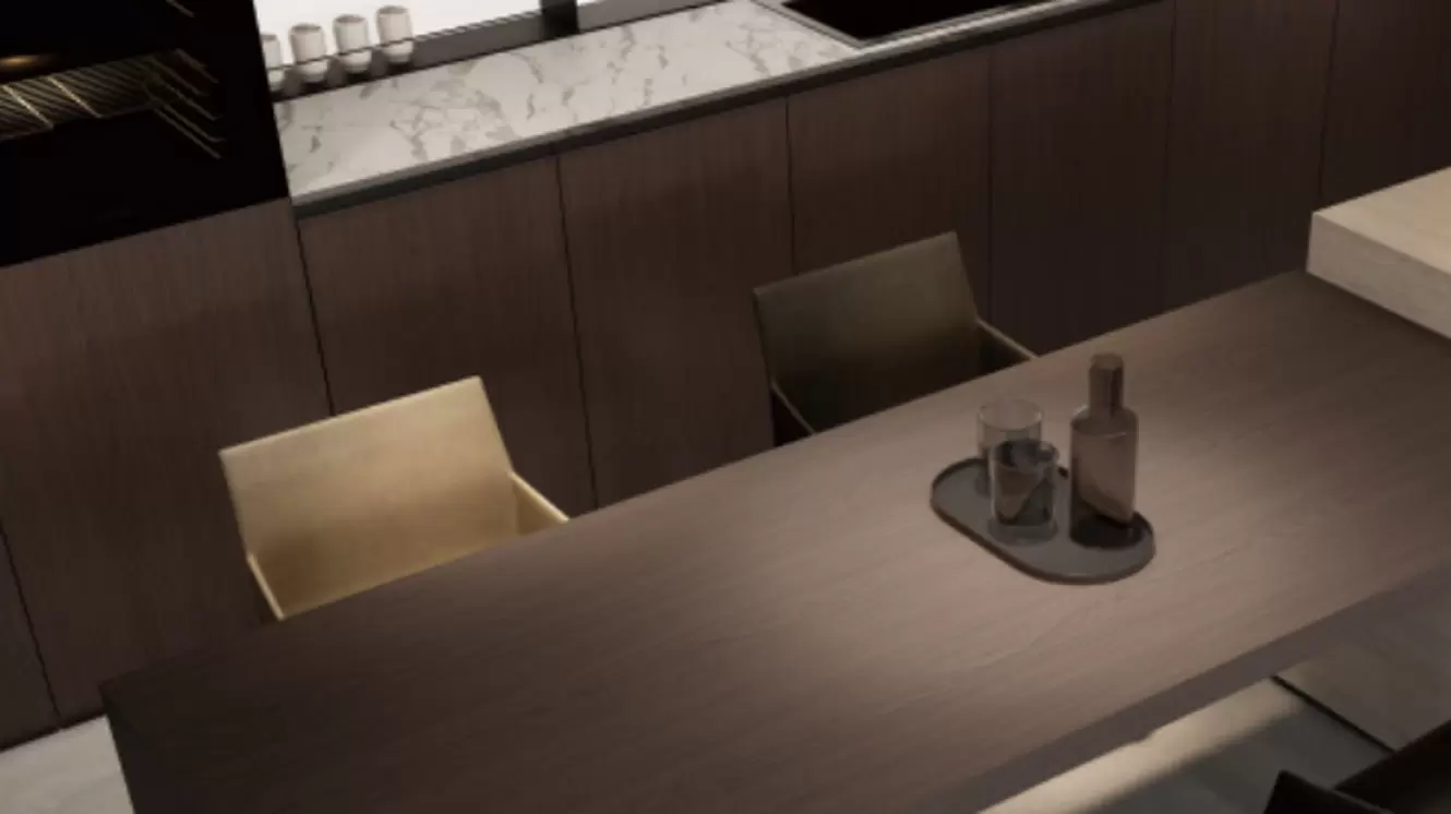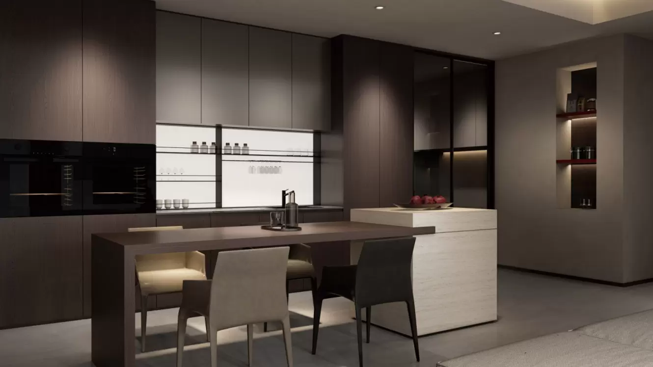خلف الباب المنزلق المزود بمفتاح بيانو، تُضفي نغماته المتراقصة جوًا فنيًا على المكان. الشرفة مُجهزة بمكتب أنيق، مما يُوفر مساحة هادئة للقراءة والعمل وسط صخب المدينة. يُستخدم نمط الحجر البيج الفاتح على منصة الجزيرة ليُضفي تباينًا مع الخزائن الداكنة المحيطة. رف الكتب في غرفة المعيشة مُزود بشريط إضاءة يُنير الكتب والزخارف بضوء خافت، مما يُضفي جوًا فنيًا. في منطقة المطعم، يوجد شريط إضاءة أسفل لوحة التحكم لإضاءة منطقة الطهي وتسهيل العمل.