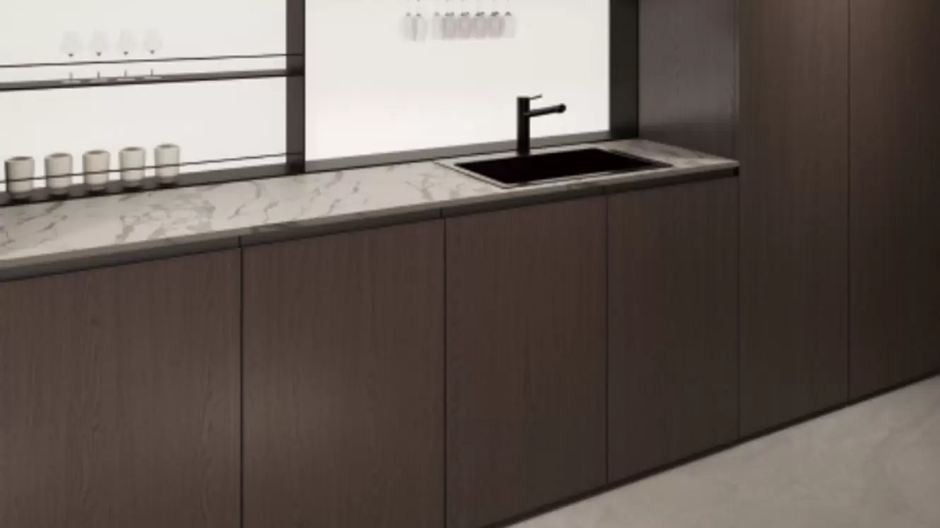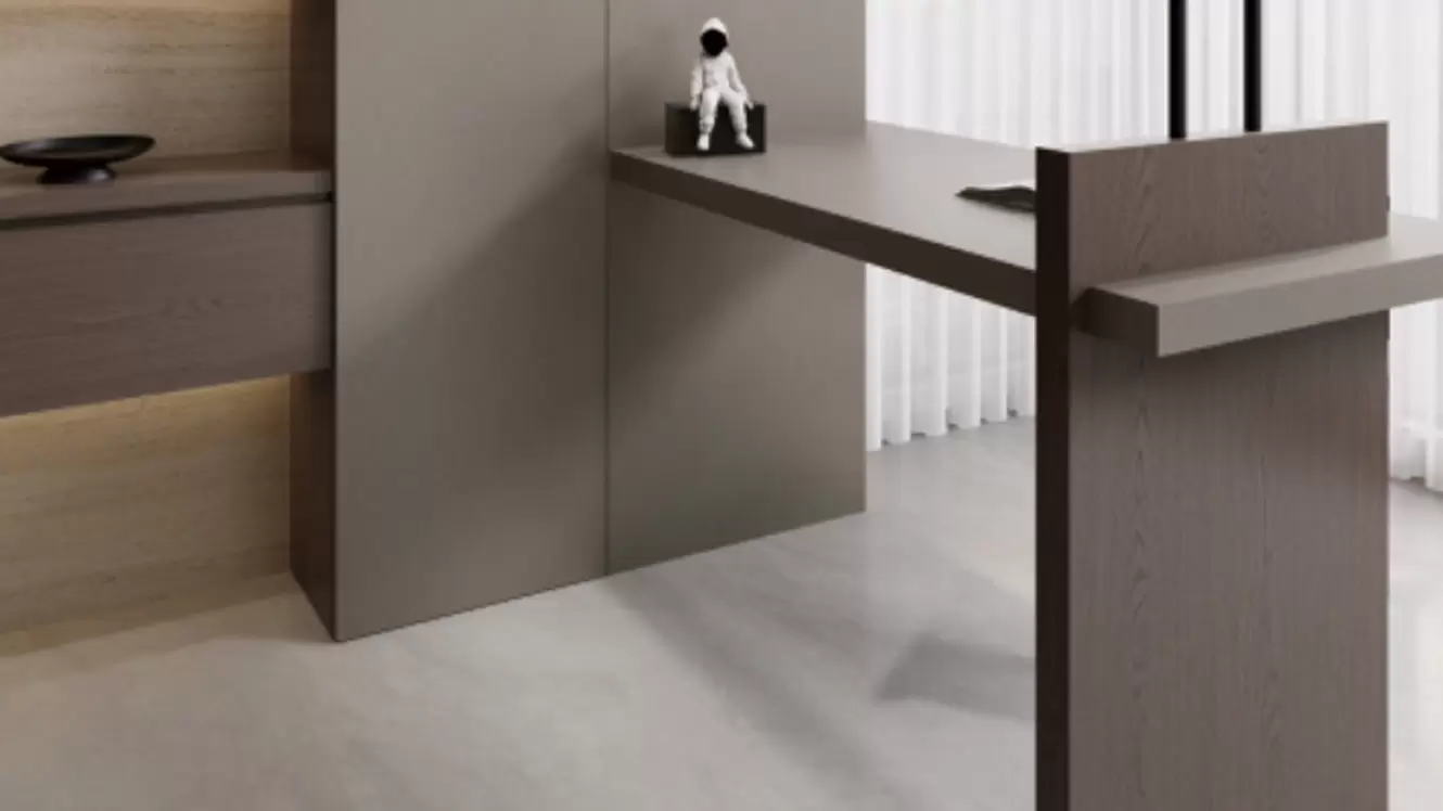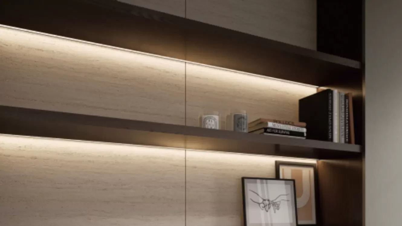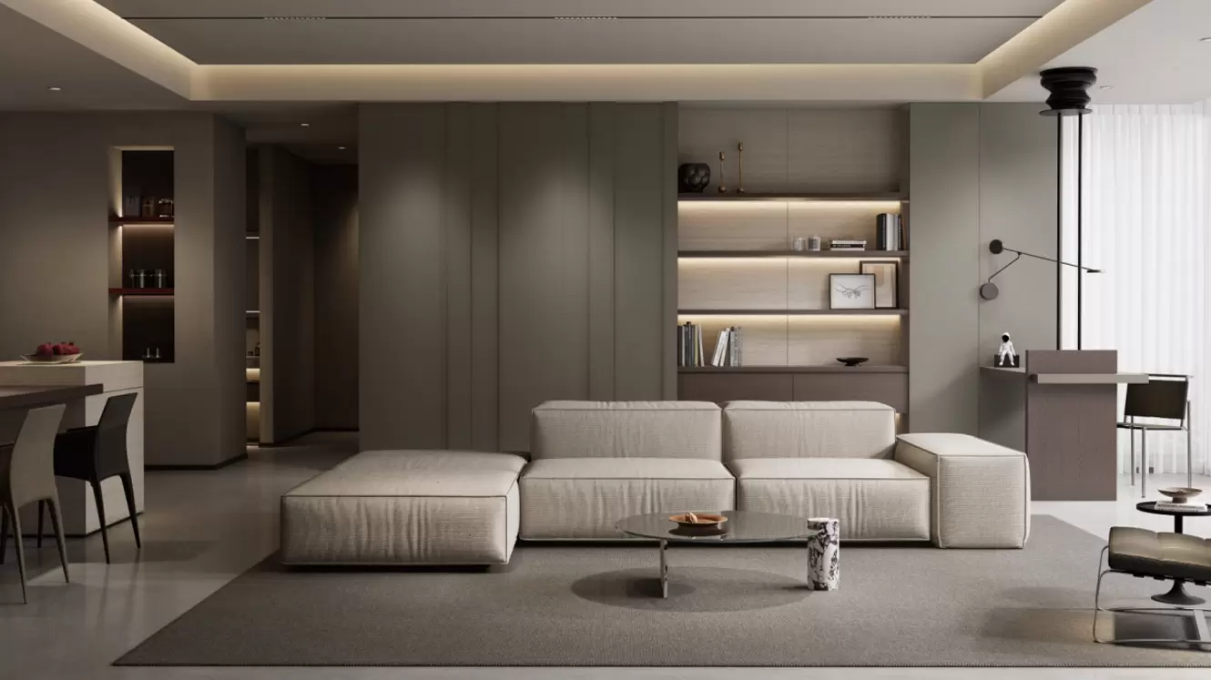 خلف الباب المنزلق المزود بمفتاح بيانو، تُضفي نغماته المتراقصة جوًا فنيًا على المكان. الشرفة مُجهزة بمكتب أنيق، مما يُوفر مساحة هادئة للقراءة والعمل وسط صخب المدينة. يُستخدم نمط الحجر البيج الفاتح على منصة الجزيرة ليُضفي تباينًا مع الخزائن الداكنة المحيطة. رف الكتب في غرفة المعيشة مُزود بشريط إضاءة يُنير الكتب والزخارف بضوء خافت، مما يُضفي جوًا فنيًا. في منطقة المطعم، يوجد شريط إضاءة أسفل لوحة التحكم لإضاءة منطقة الطهي وتسهيل العمل.