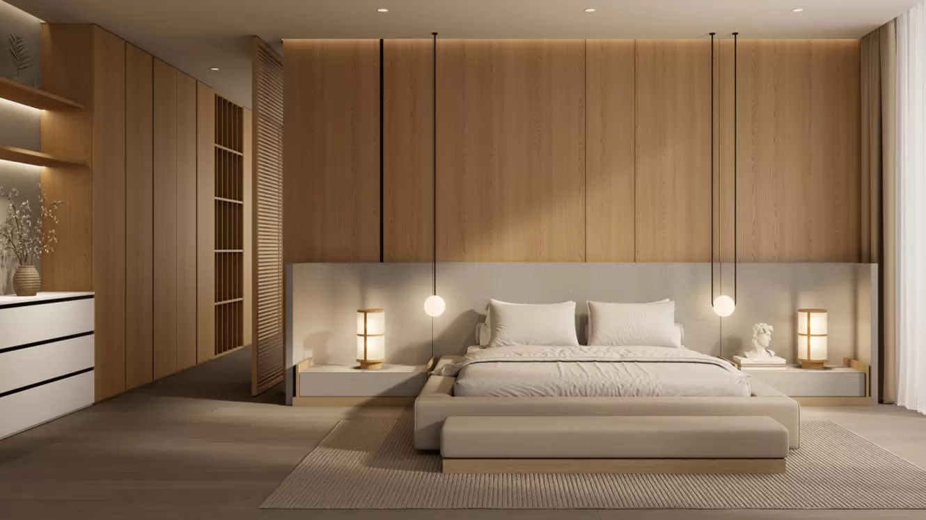 عند دخول غرفة النوم، يلفت جدار خلفي منحني فريد، بانحناءاته الناعمة التي تضفي حيوية وأناقة على المكان. خزانة الملابس على اليسار لا تتميز بوظائف تخزين فعّالة فحسب، بل تُستخدم أيضًا كركن من أركان رف الكتب، مما يُسهّل الوصول إلى كتبك المفضلة. خلف الباب الشبكي المُغلق، توجد غرفة ملابس خاصة. تتكامل العناصر البيضاء وأغطية السرير البيج الفاتحة والستائر مع بعضها البعض، وتحت الإضاءة الخافتة، تسود غرفة النوم أجواء هادئة ومريحة، وكأنها ملاذ طبيعي في صخب المدينة، مما يسمح للناس بالانغماس التام في هذا الجو الدافئ والمريح.