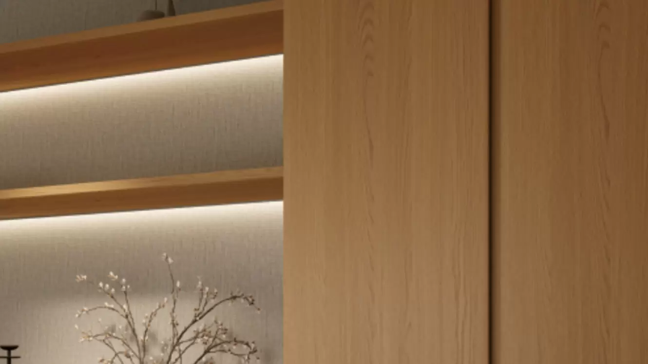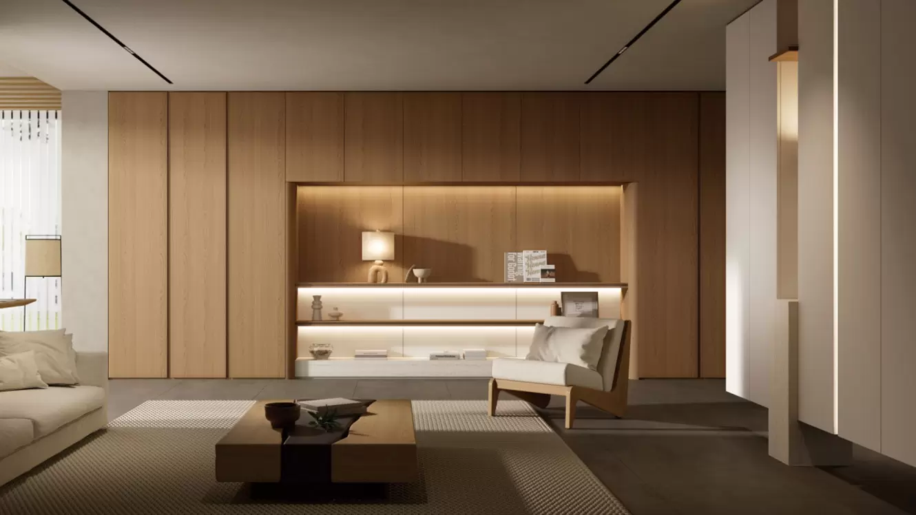 عند دخول غرفة المعيشة، تطل مساحة واسعة من خزائن خشب البلوط الأحمر الكاليفورني، العملية والغنية بالغاز الطبيعي. تتميز الخزانة على يمين غرفة المعيشة بتصميم فريد، حيث تُستخدم كخزانة أحذية وخزانة فاصلة. فهي لا تخزن الأحذية فحسب، بل تقسم المساحة بذكاء. يُبرز تصميم ياباي الجزئي جمال المكان، مُكملاً الأريكة والبطانية المصنوعة من قماش الكتان الفاتح، مما يخلق جوًا دافئًا. تظهر ظلال مسام الصخور بشكل خافت، مما يُضفي لمسة من العمق على المكان. يتسلل الضوء الدافئ، فيشعر الناس بالاسترخاء بمجرد دخولهم.